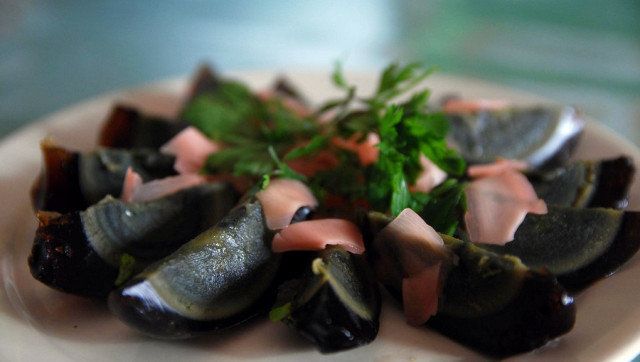 This delicacy was formerly called imperial. And all because of the rather complicated marinating process. The egg is stored in a mixture of clay, ash, and quicklime for several months. During this time, the yolk turns dark green or even black and slippery, and the white turns into a dark brown translucent jelly. The egg is rather harsh to the smell, but despite this, it is still considered a valuable Asian delicacy.